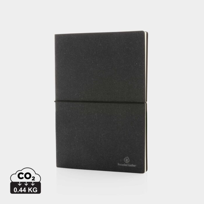 Description Carnet de notes A5 avec couverture en cuir recyclé et reconstitué 80 feuilles/160 pages de 75g/m² (papier recyclé couleur crème). Emballé sans plastique dans une pochette FSC.